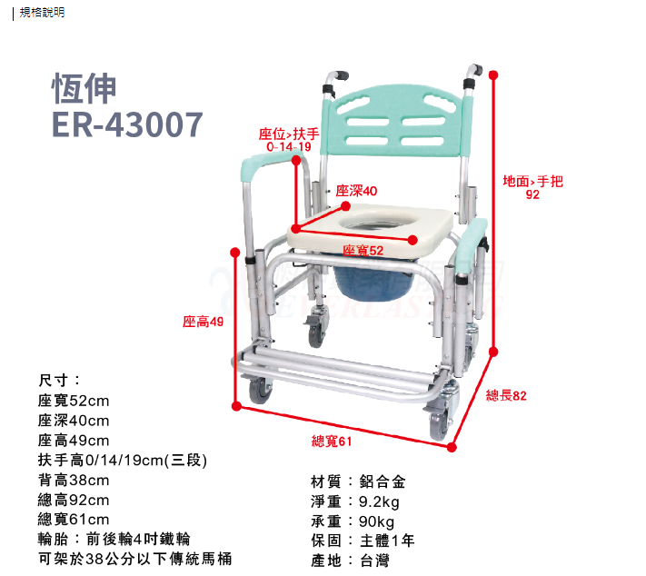 恆伸 鋁合金有輪便器椅ER-43007