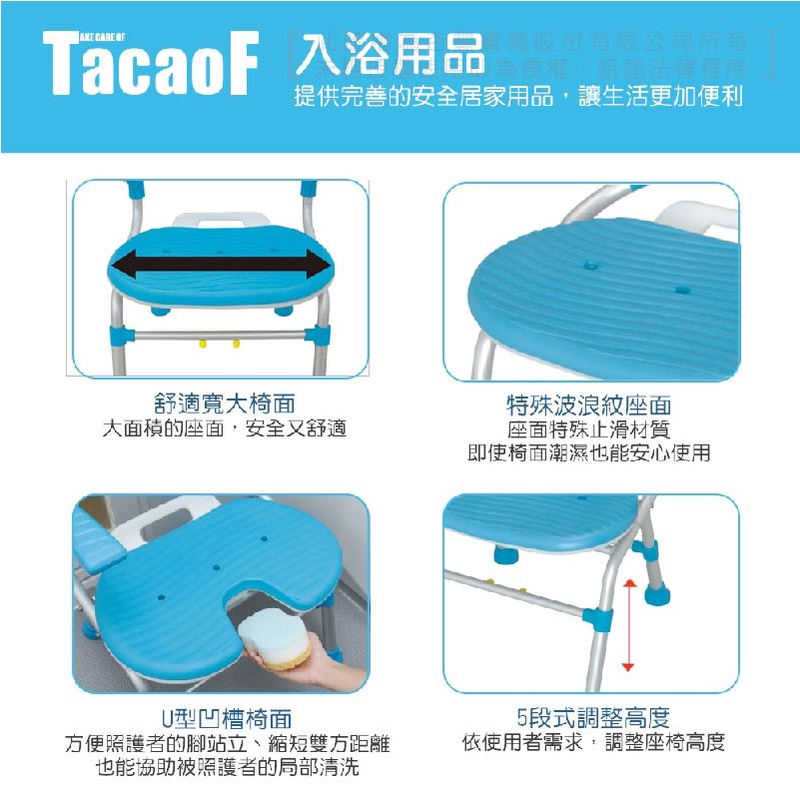•U型凹槽椅面-方便照護者的腳站立、縮短雙方距離也能協助被照護者的局部清洗