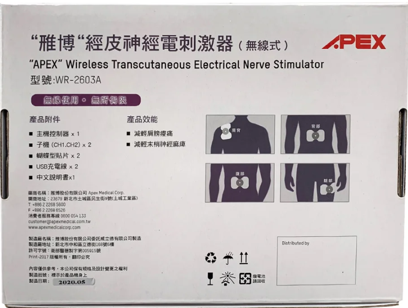 醫療器材許可證所載品名:“雃博”經皮神經電刺激器(無線式)