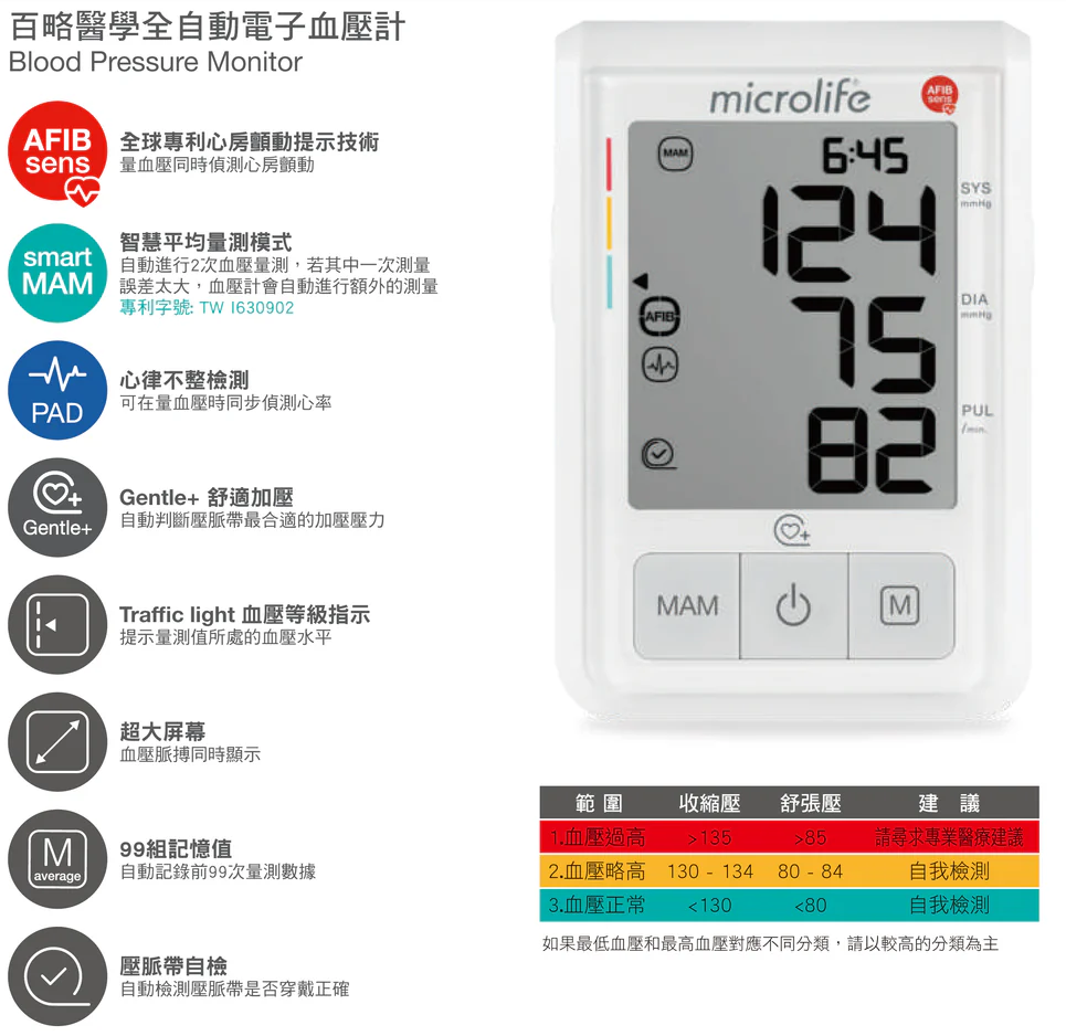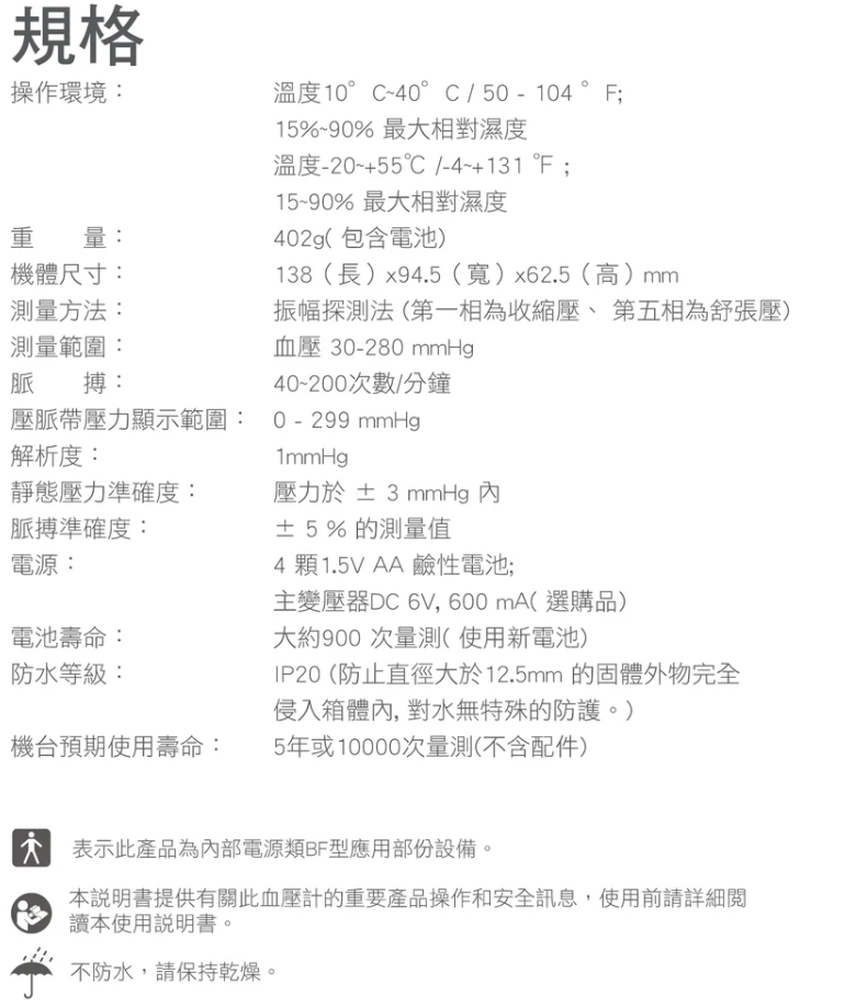 測量範圍:血壓30-280 mmHg/脈搏:40~200次數/分鐘